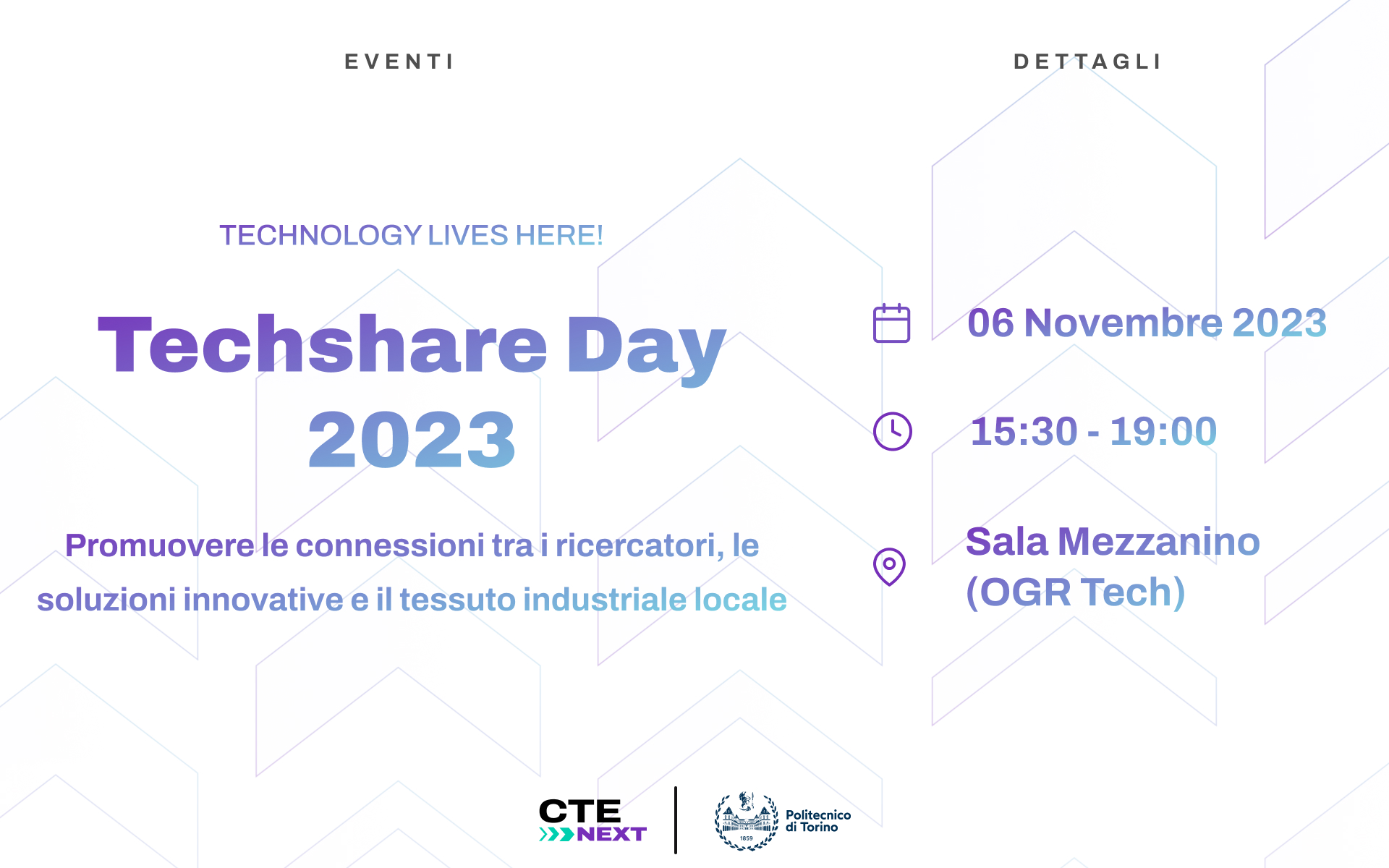 La nuova edizione di Techshare Day 2023 sarà dedicata alla presentazione ad aziende ed investitori di una selezione di tecnologie o prototipi tecnologici che sono stati sviluppati da gruppi di ricerca del Politecnico di Torino, dell’Università degli Studi di Torino o di Fondazione Links.